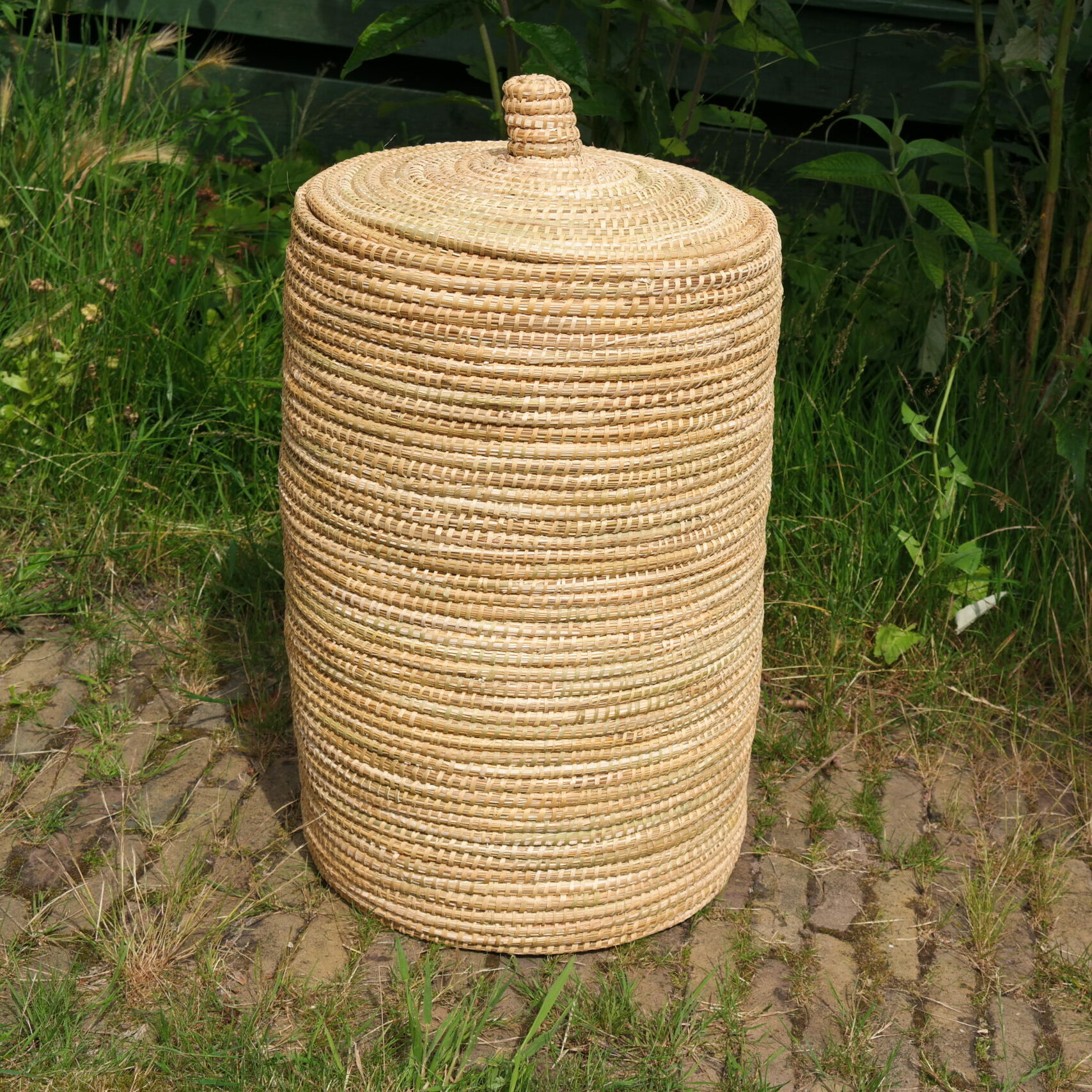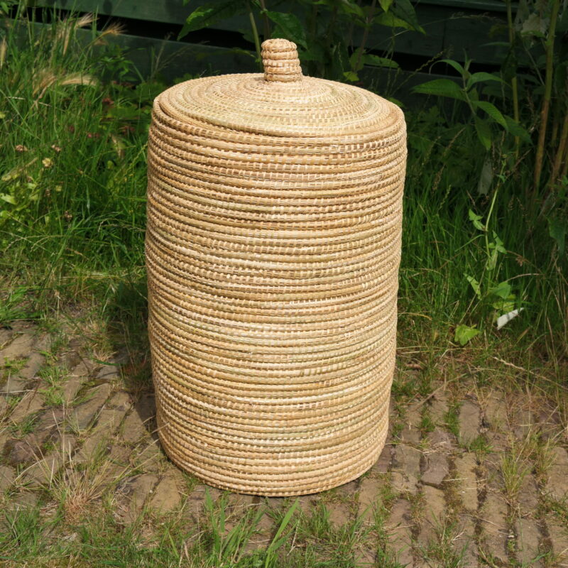 This basket is about 53 cm / 20,86 inches high and has a diameter of about 37 cm / 14,5 inches. Either alone or together with some other baskets, this can provide a very attractive picture in your home. In addition, this basket - because of the closing lid - is also ideal for storing things. How about this basket as a laundry basket? We have a laundry bag with it; please contact us for this. In addition, it is also perfect for storing a whole load of toys, or a set of nice blankets. In short; you can really use this nice basket in many ways.