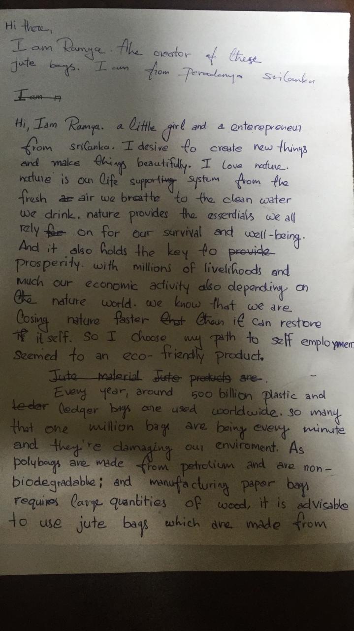 Ramya lives in Sri Lanka and she has written a letter herself about her bags and why she makes them. We have the letter below.