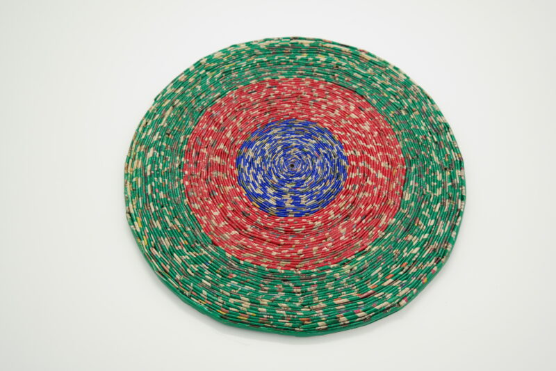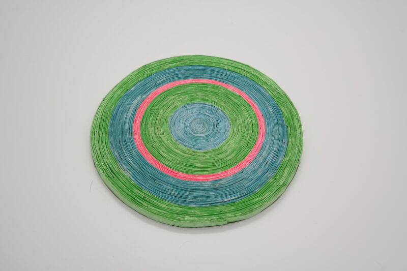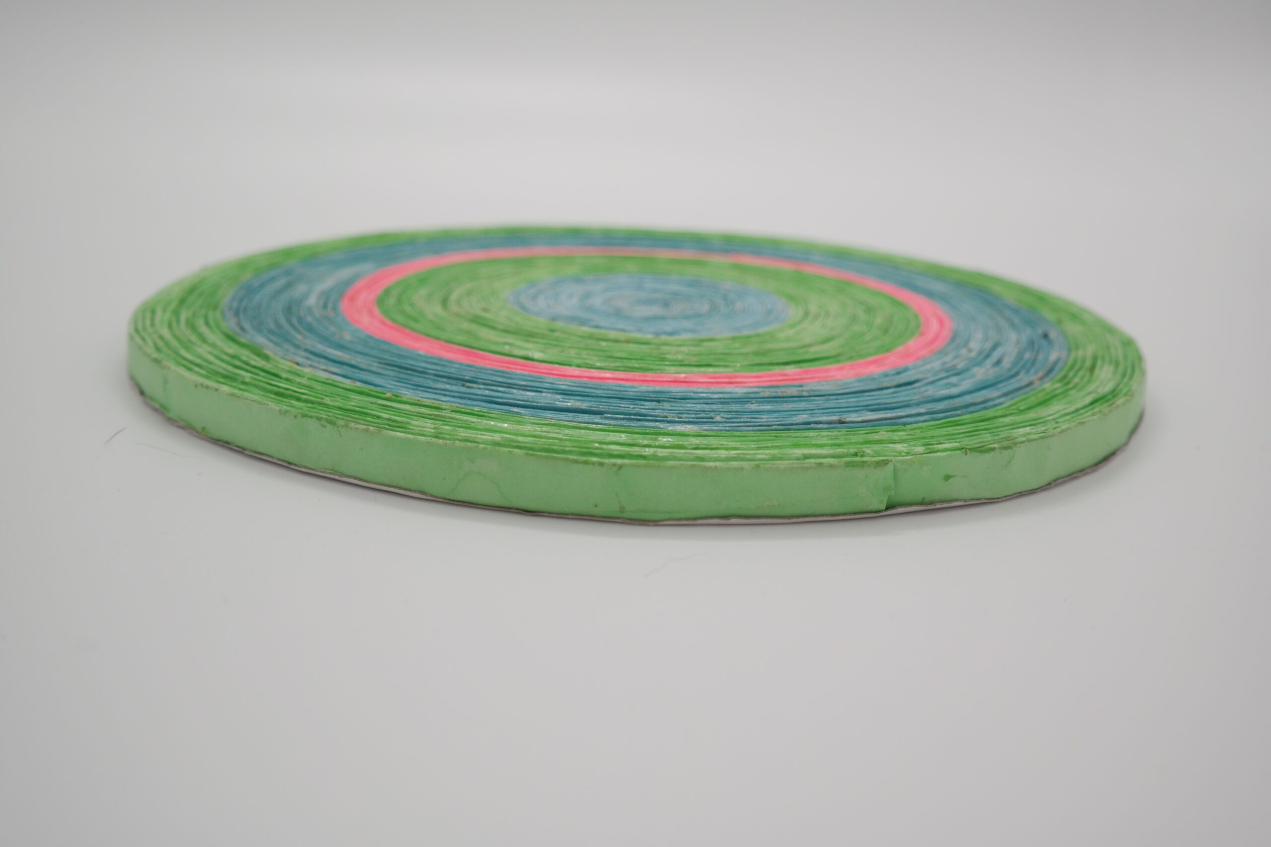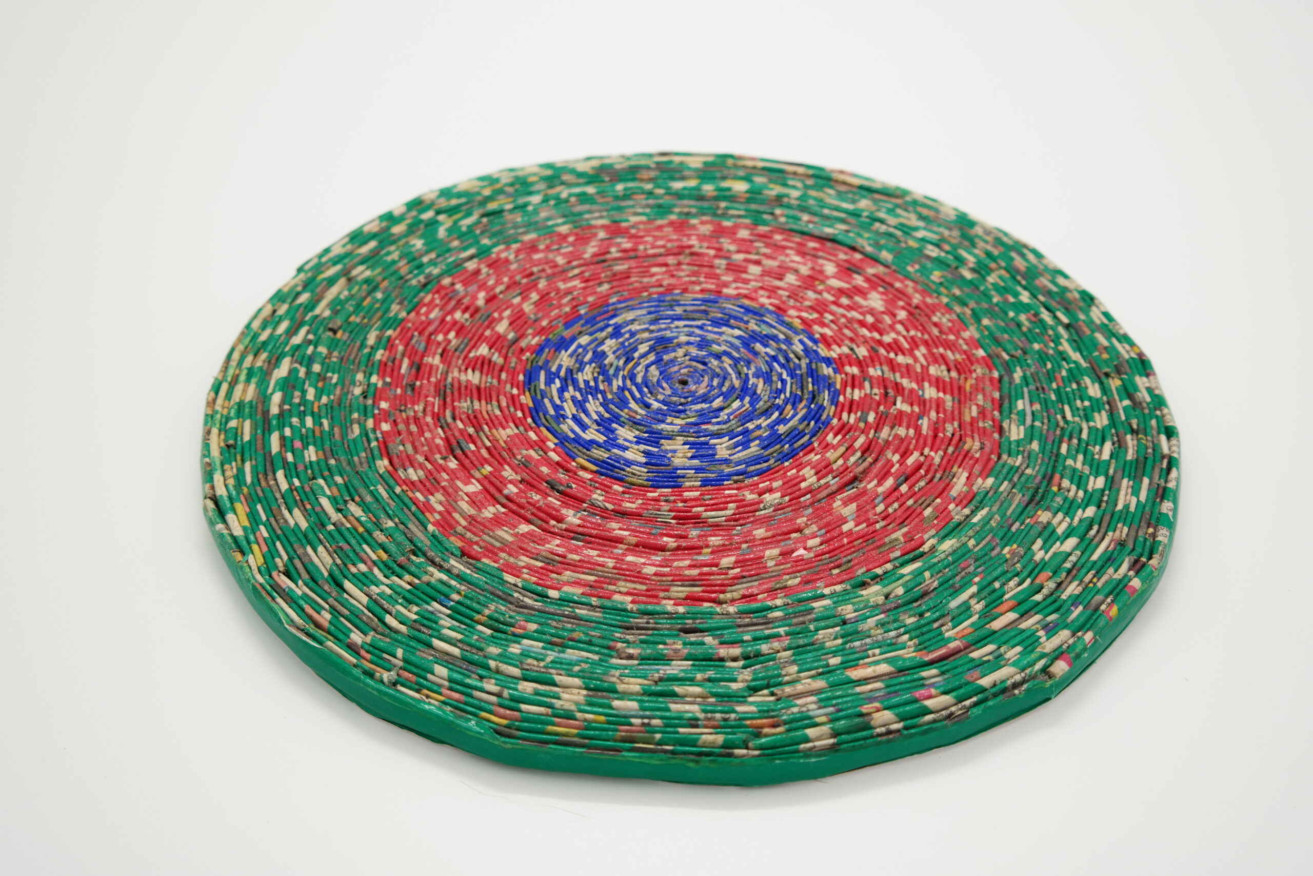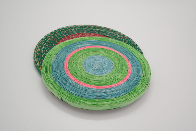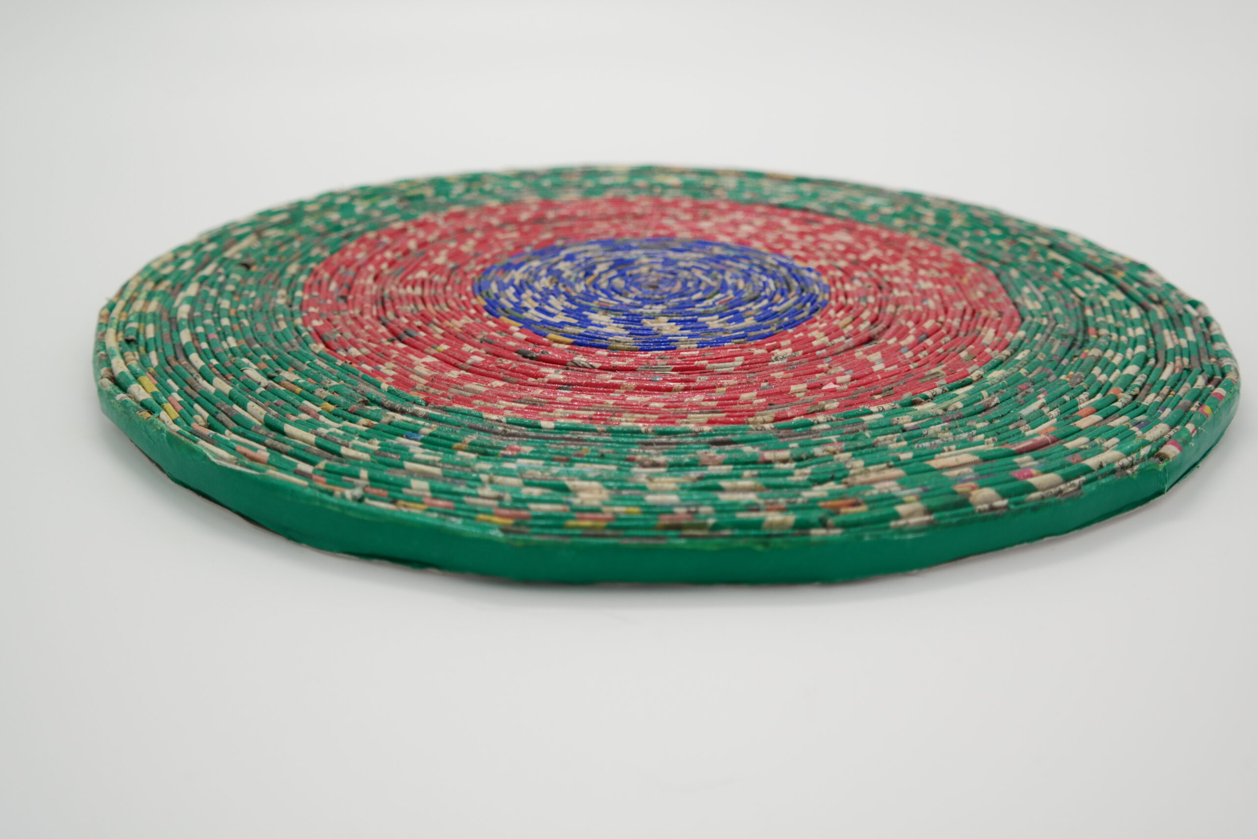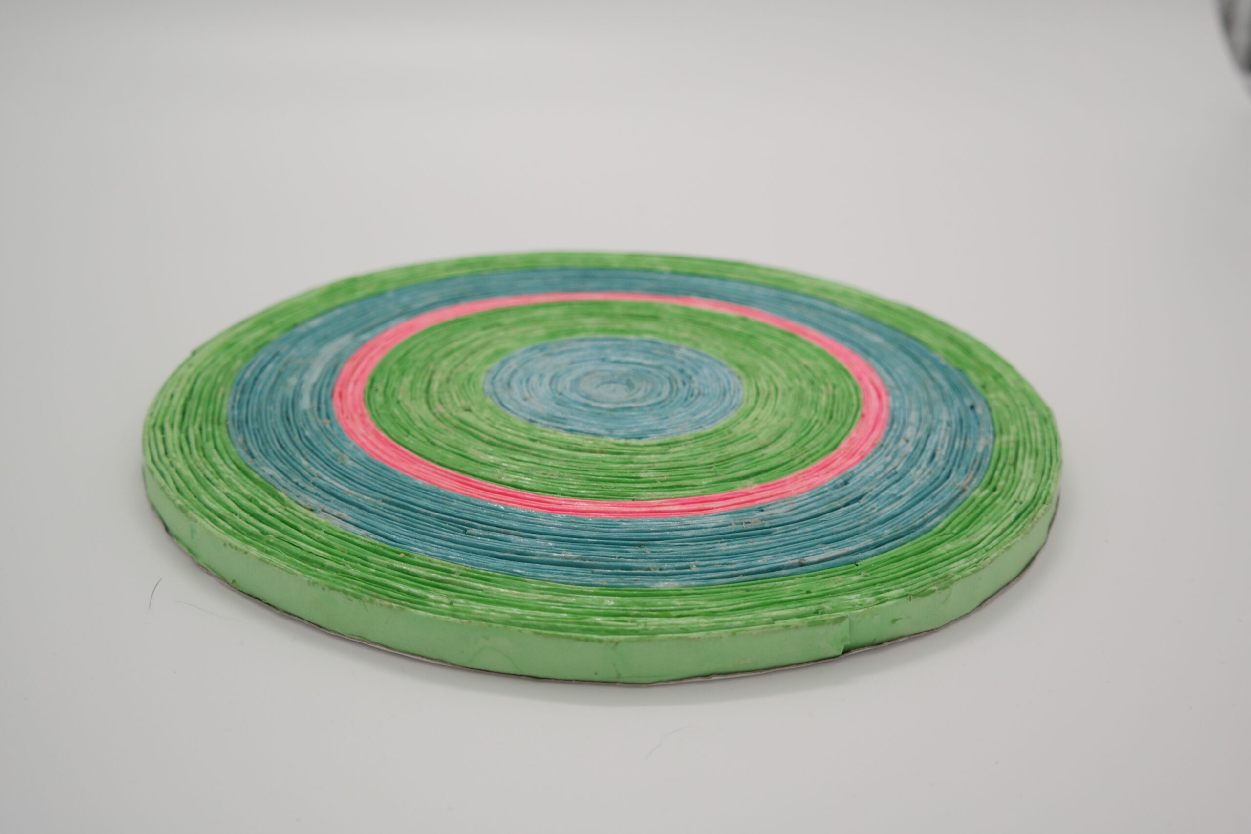 Each coaster (small ones for your glasses and the large ones for your pans) is unique in color and pattern. They are sturdy and finished. They are made from old newspapers and colored paper. The coasters are a Friendly Product.