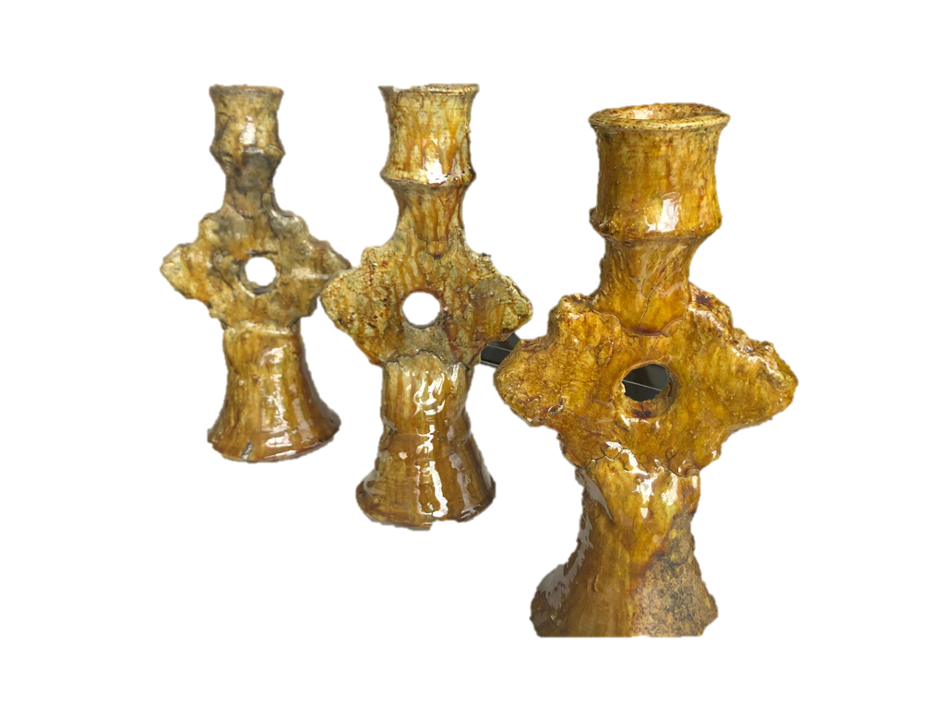 The candlestick is handmade, making each one unique and both the shape and the yellow glaze of each stand are different.