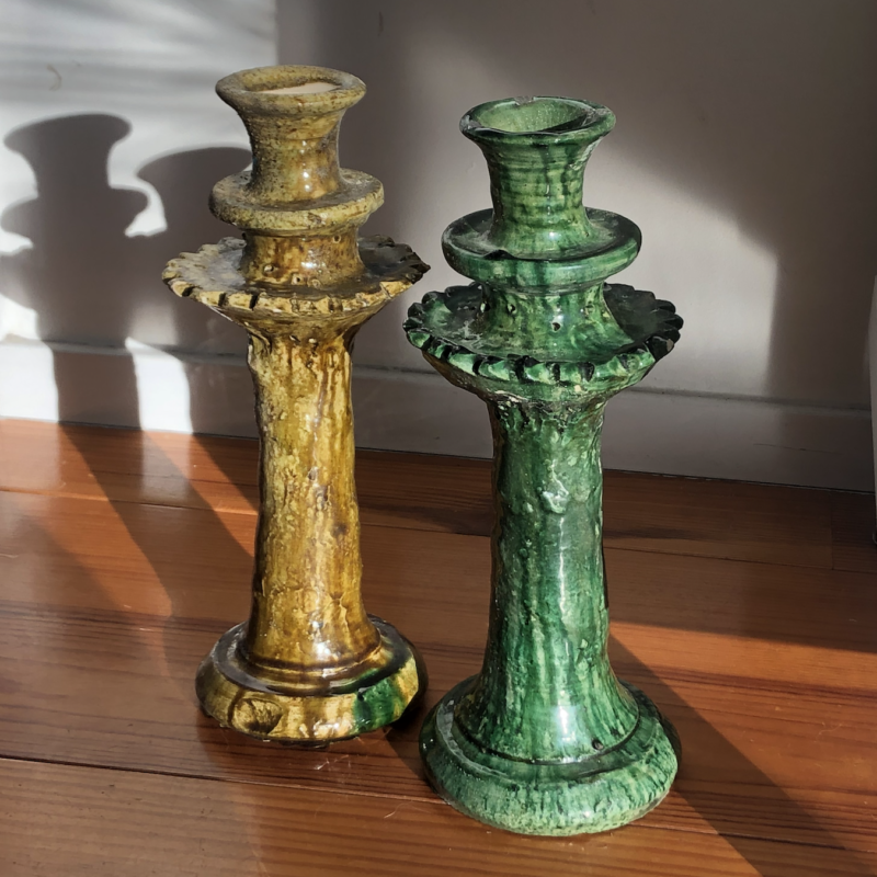 Tamegroute is extremely popular for its unique green and yellow pottery, whose glaze-making process is still an old tribal secret. Designed and handcrafted in the village by expert local artisans, this yellow candlestick has its own unique markings and texture, created during the firing process.