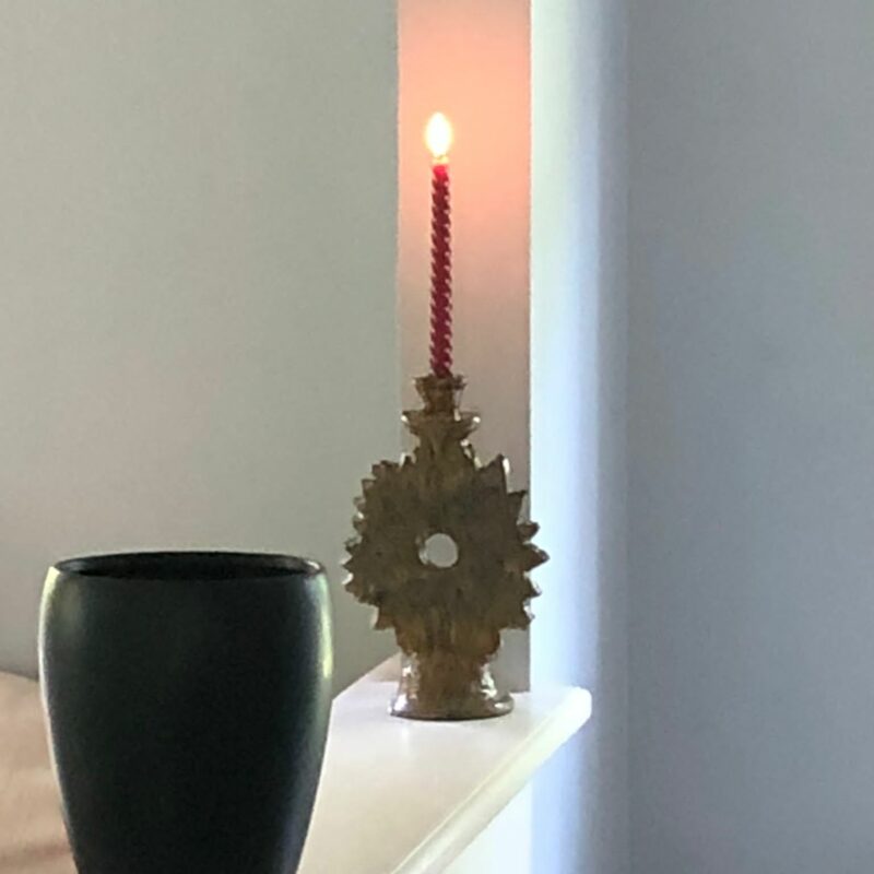 The sun on this candlestick is a symbol of the Amazigh (Berber) culture. It stands for 'hope and light'. A nice sign to have in the house.