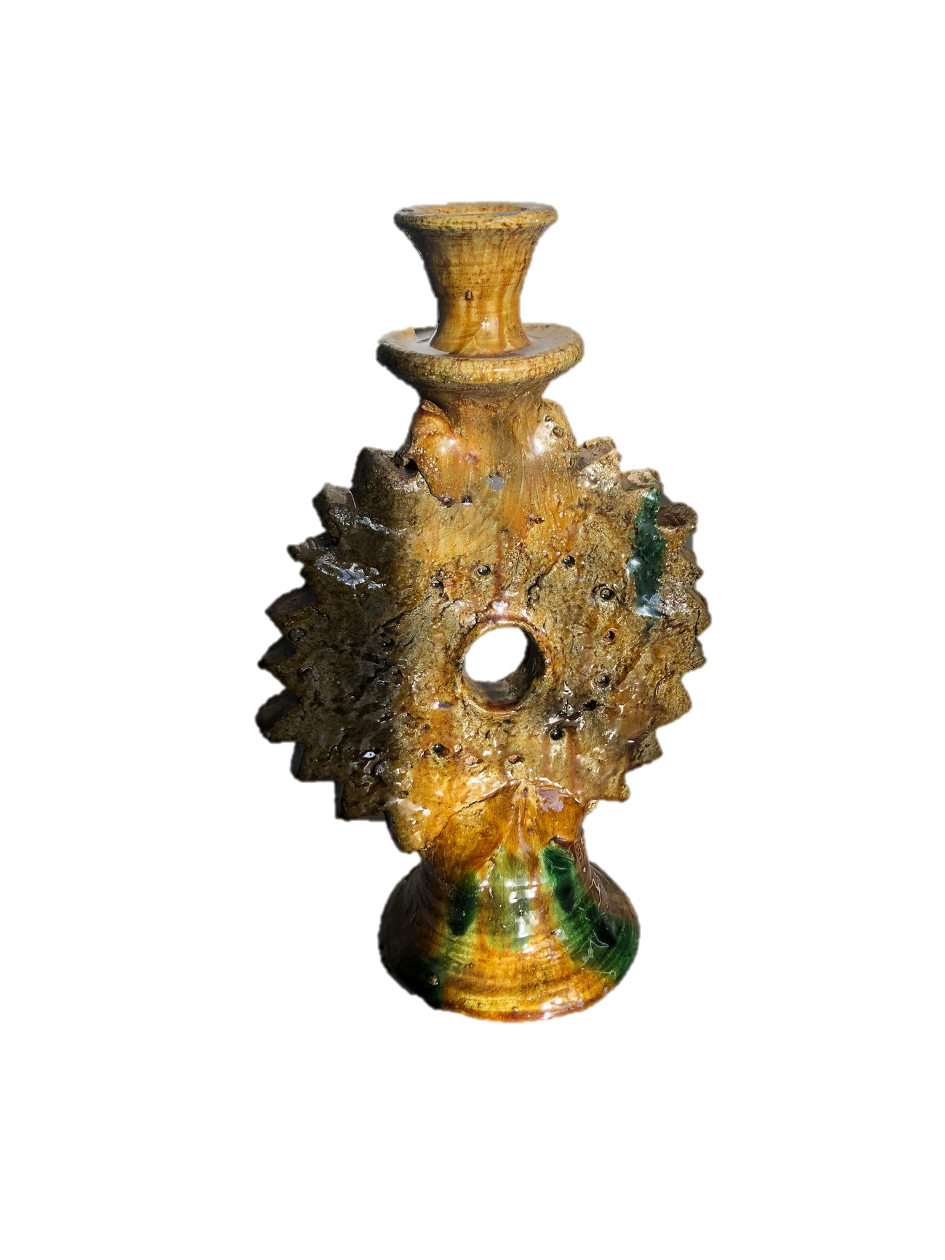 Features of the ocher yellow earthenware candlestick sun from Tamegroute are: