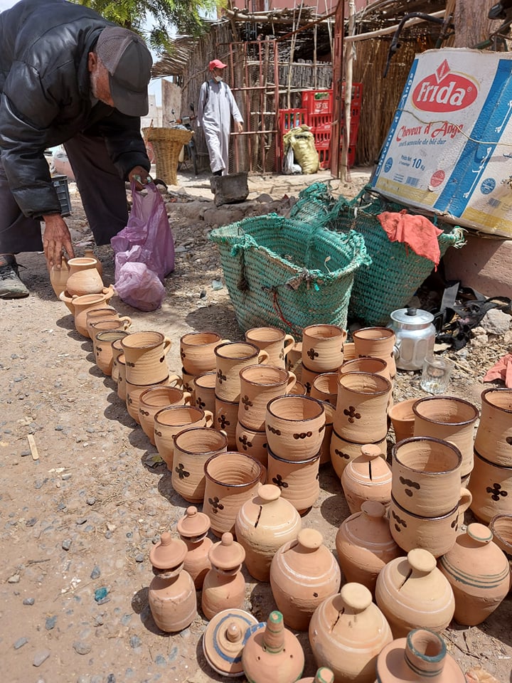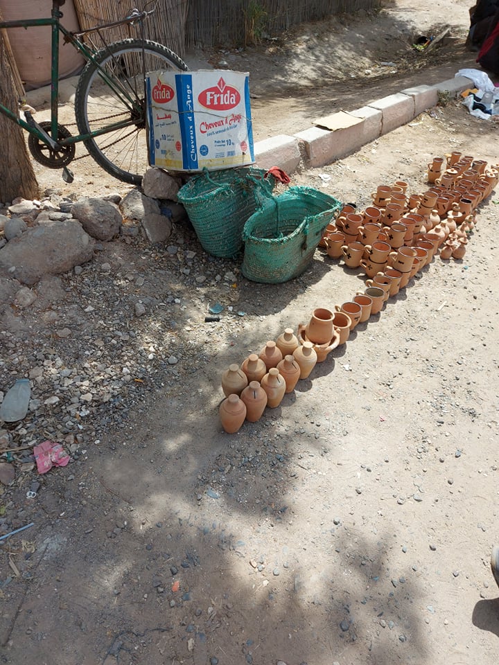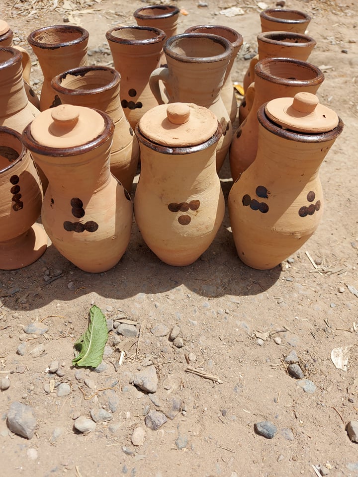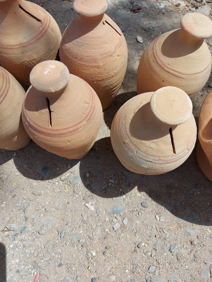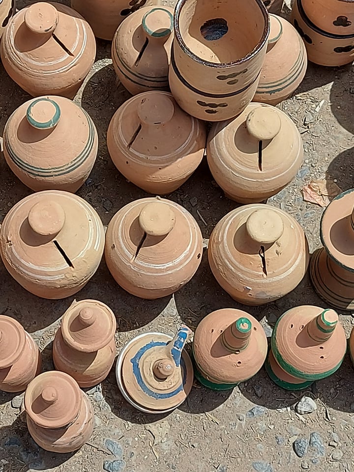 Aardewerk spaarpotjes die ter plekke door Hilde ingekocht zijn.