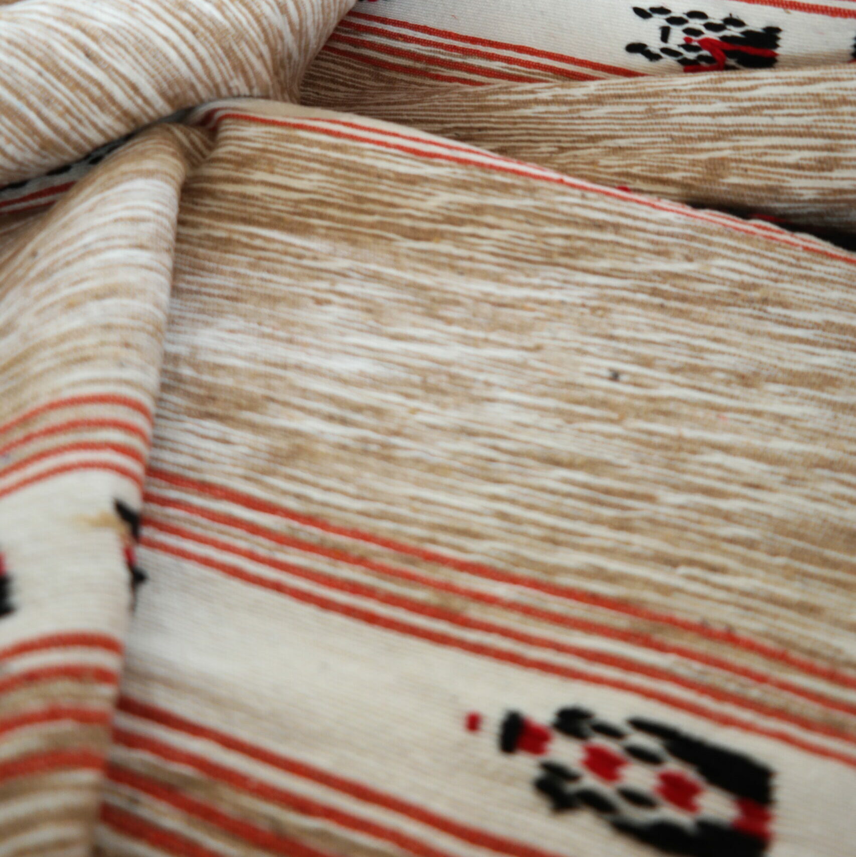 Ook zo'n zin om af en toe lekker op de bank weg te kruipen onder een lekker dekentje? Dat kan met dit schitterende beige wollen kleed met rood accent. Het is ook ideaal om als grand-foulard op de bank te hebben liggen.