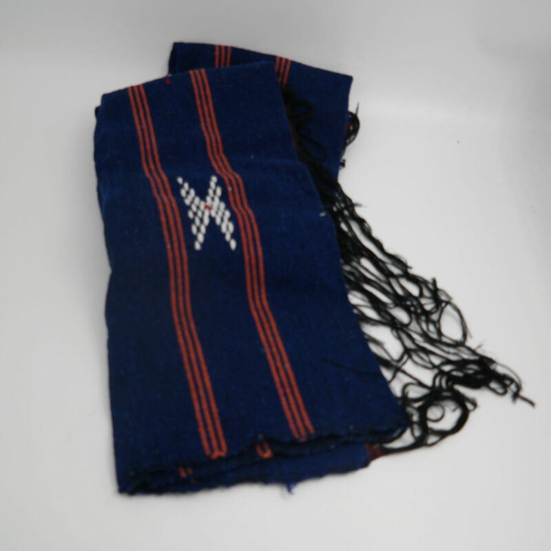 Omdat het blauw wollen plaid met rood en wit motief handgemaakt is kan de kleur en de vorm iets afwijken.