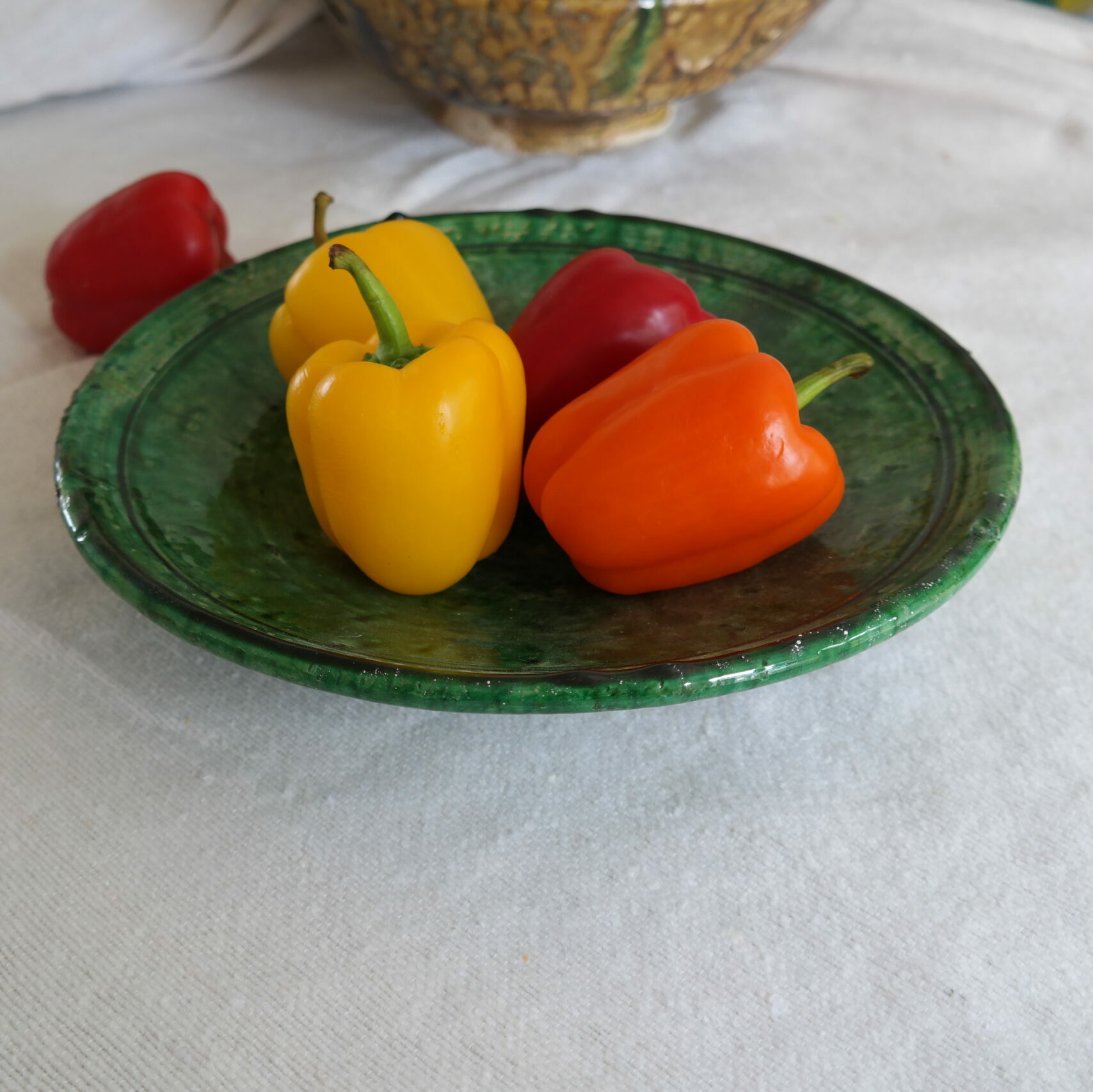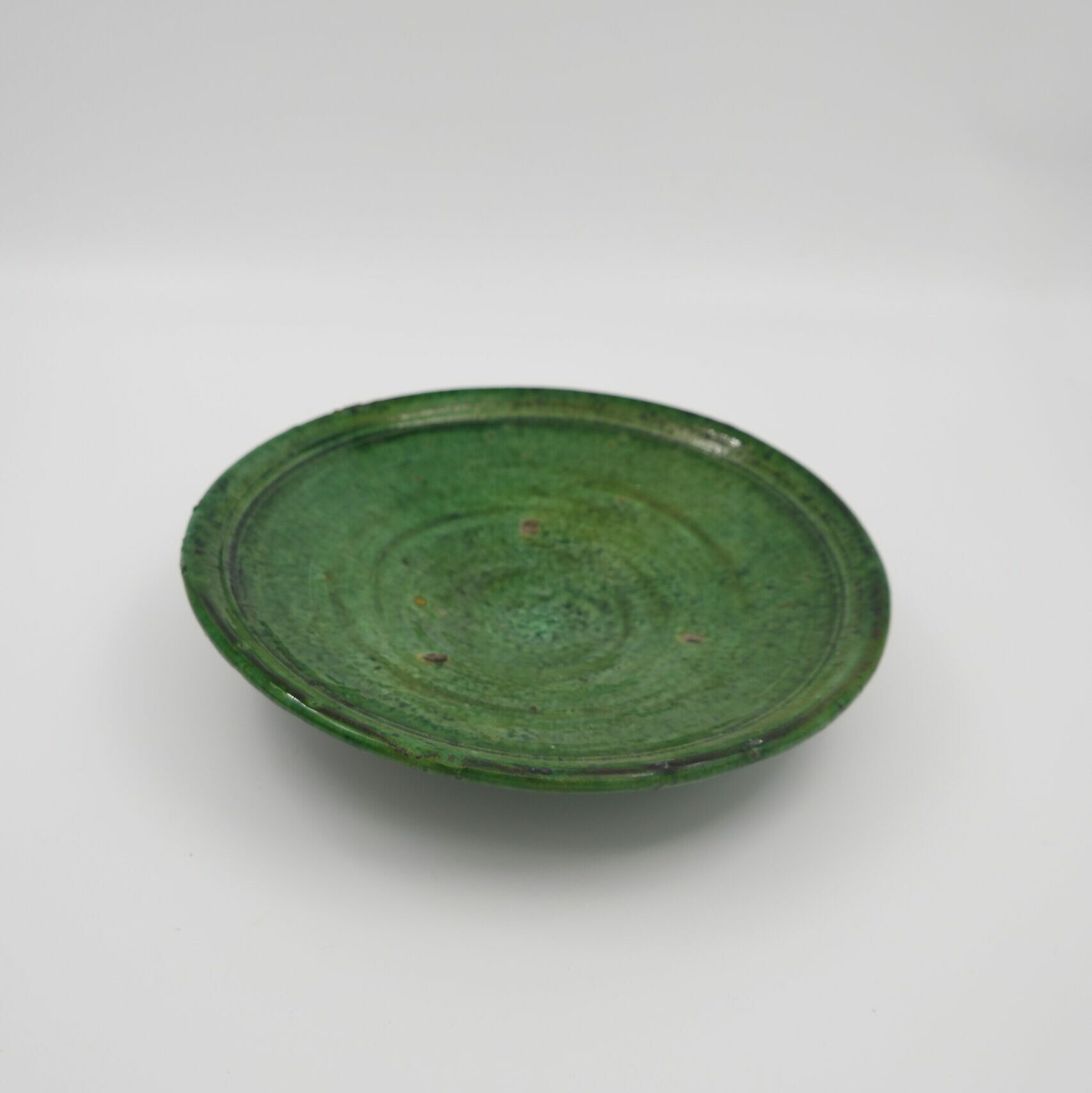 Het is geen volmaakt fabriekswerk, en dat is juist de charme van deze mooie groene aardewerken platte schaal.