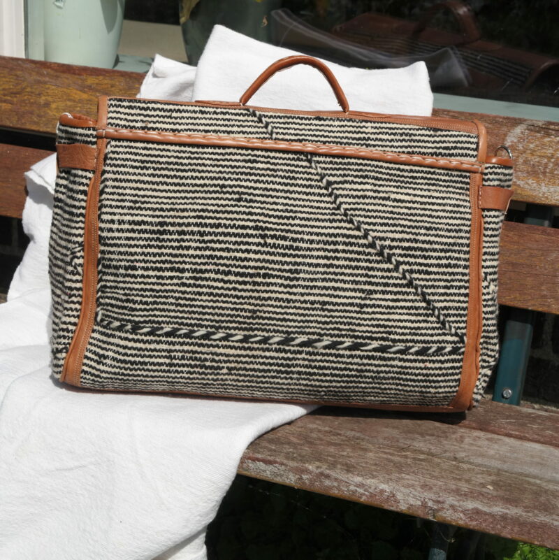 Dan is deze grote leren reistas met zwart-wit kelim echt iets voor jou!