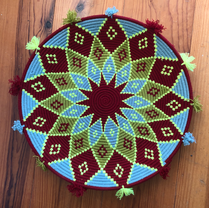 De schaal is 53 cm diameter en van riet, die omwikkeld is met donkerrode (bordeauxrode), lichtblauwe gele en okergele wol. De schaal heeft ook kleine poms aan de zijkant. Voor dat bijzondere effect. Deze schaal is handgemaakt door vrouwen uit Marokko. Door de huidige crisis is hete leven erg zwaar in Marokko en alle beetjes helpen. Met de aanschaf van deze schaal zorg jij voor een eerlijk inkomen in  een Marokkaans gezin.