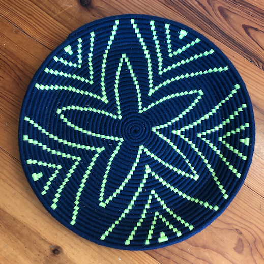 De schaal is 50 cm diameter en van riet, die omwikkeld is met zwarte en gele wol. Voor dat bijzondere effect.