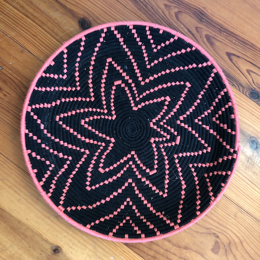 De schaal is 50 cm diameter en van riet, die omwikkeld is met zwarte en roze wol. Voor dat bijzondere effect. Deze schaal is handgemaakt door vrouwen uit Marokko. Door de huidige crisis is hete leven erg zwaar in Marokko en alle beetjes helpen. Met de aanschaf van deze schaal zorg jij voor een eerlijk inkomen in  een Marokkaans gezin.