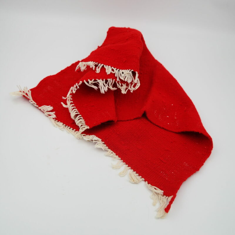Dit handgemaakt rood wollen kleedje en andere artikelen (er is nog veel meer op voorraad) zijn gemaakt in het zuiden van Marokko. Omdat we de spullen fair-trade verkopen en we direct contact hebben met de makers kunnen we je hier laten zien hoe het weven in z’n werk gaat.