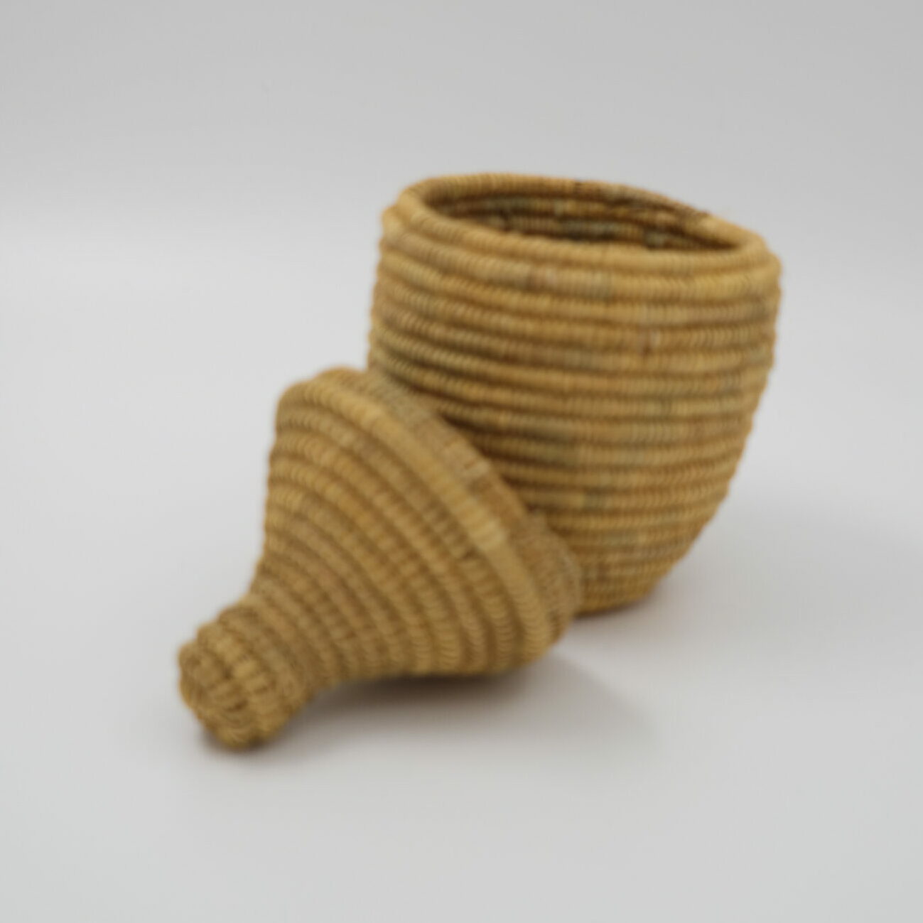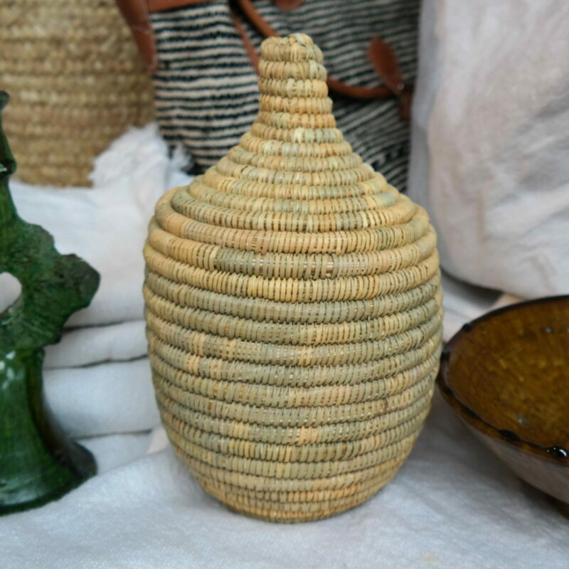 • Prachtige handgemaakte rieten mand met ronde vormen en deksel