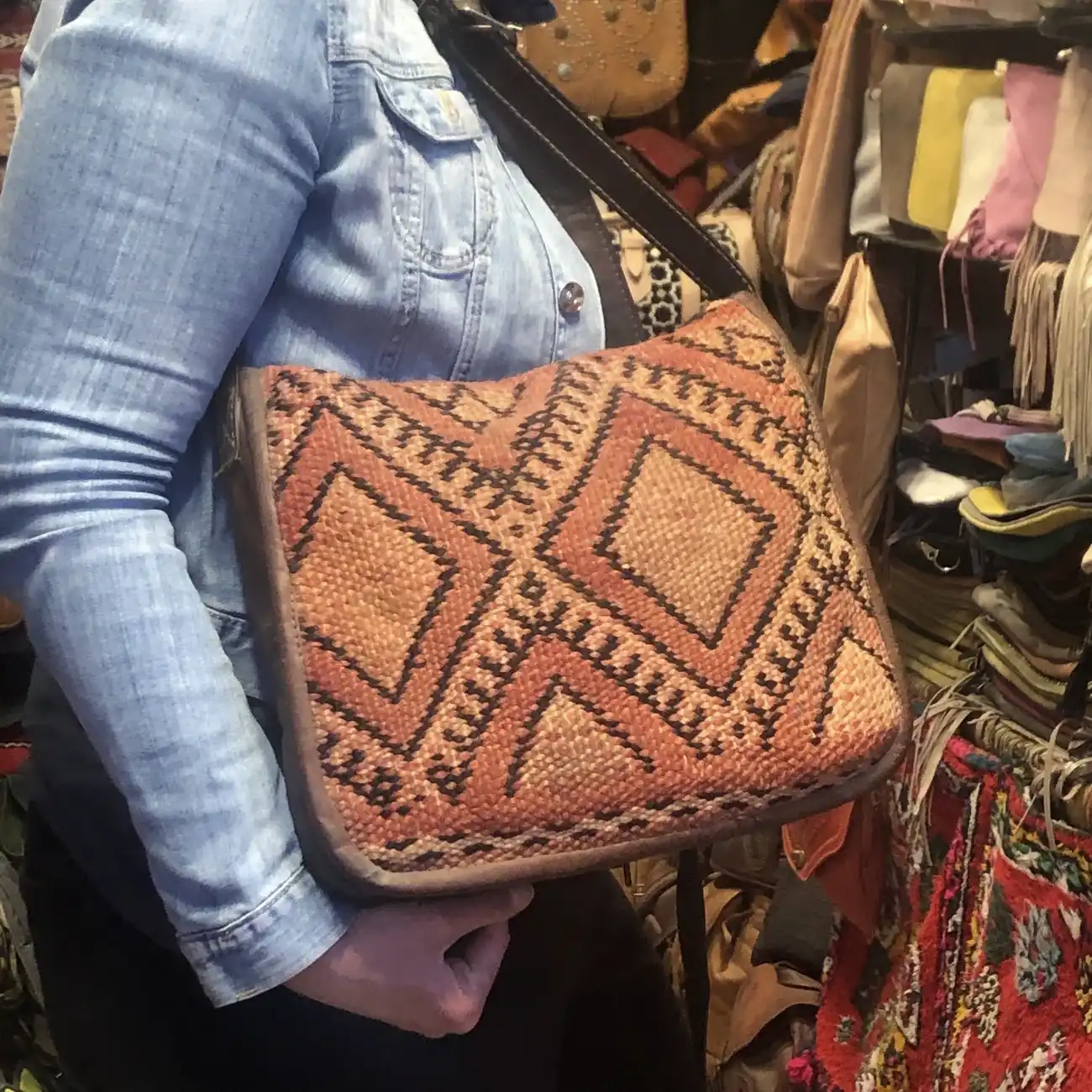 - Schitterende handgemaakte leren schoudertas met kelim.