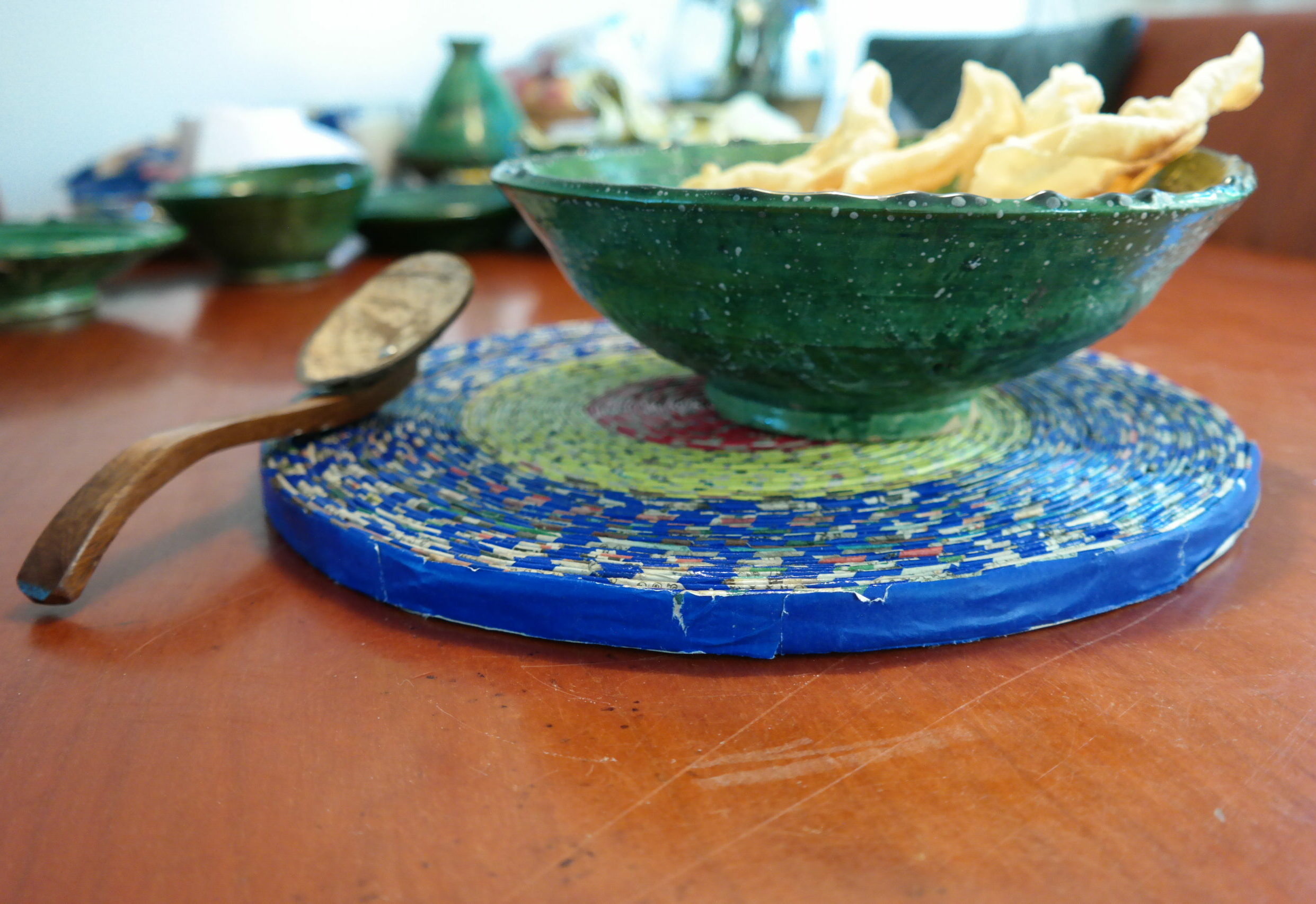 De schaal is handgemaakt in Tamegroute in Marokko. Met de aanschaf hiervan help je de pottenbakkers die dit aardewerk maken aan een inkomen; doordat er nu geen toeristen in Marokko komen is een aanvulling op hun inkomen hard nodig.
