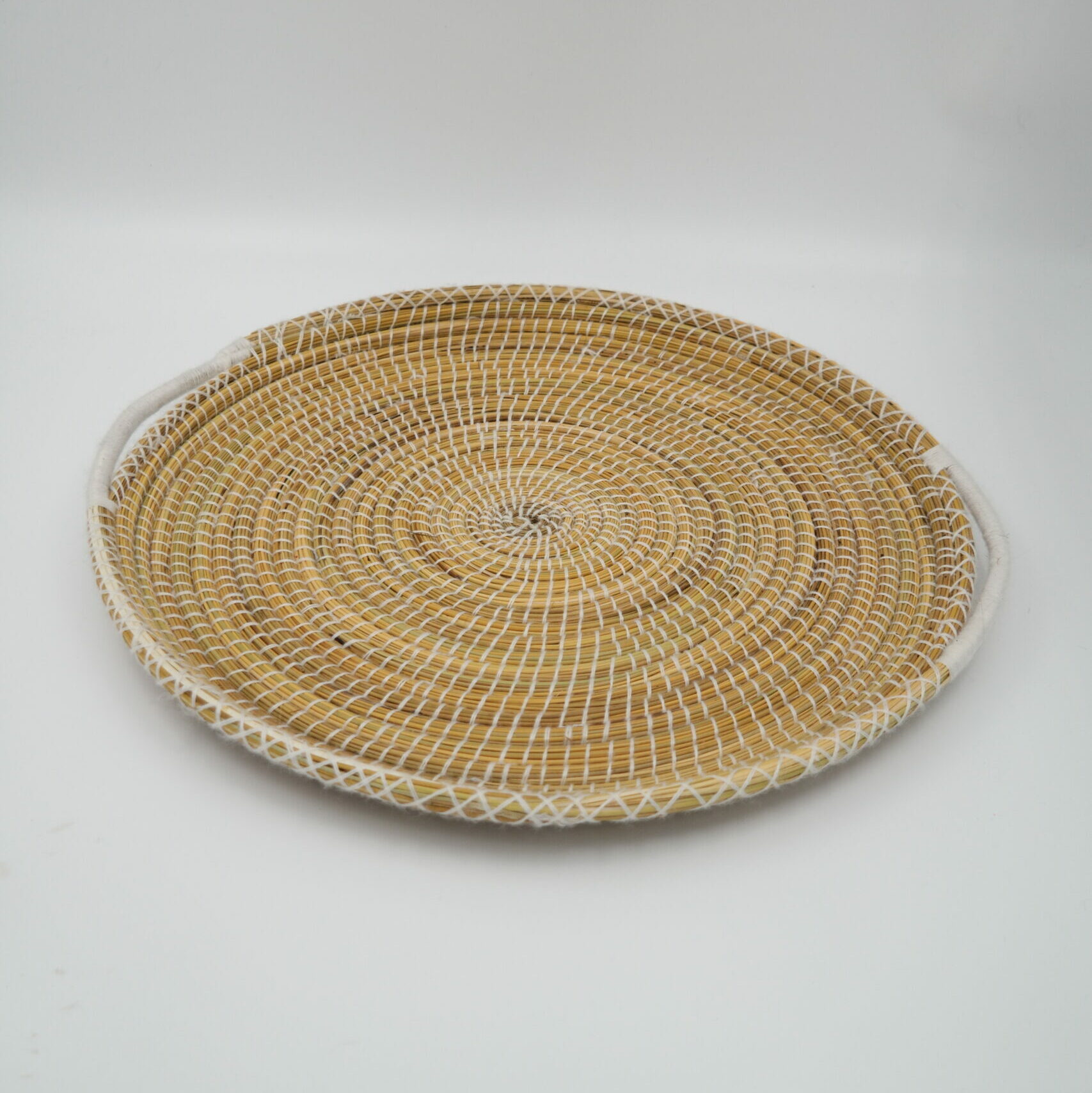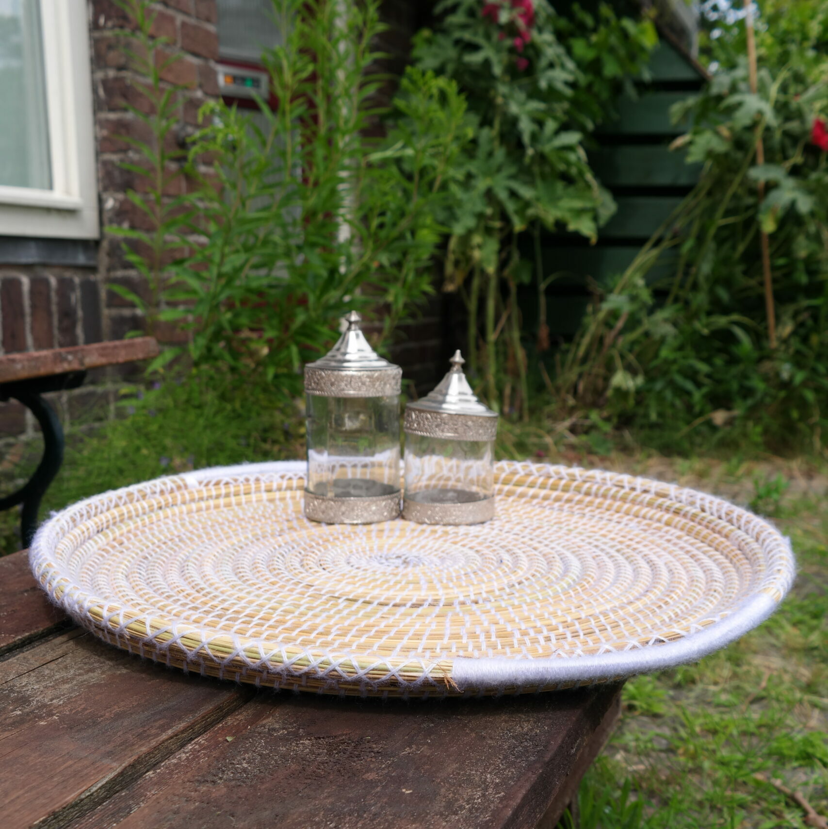 - Schitterende handgemaakt, rieten dienblad met wit touw. Diameter 45 cm.